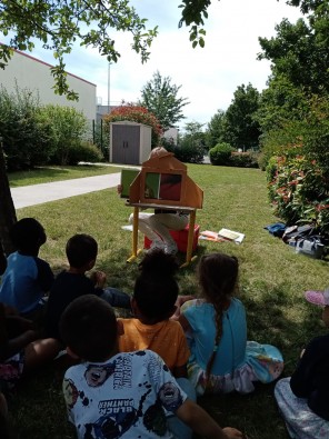 Pour ce projet, les élèves des quatre classes, accompagnés de leurs enseignantes, ont pu apprécier la lecture d'albums Kamishibai (théâtre d'images japonais) par les bibliothécaires du bibliobus dans le jardin de l'école.