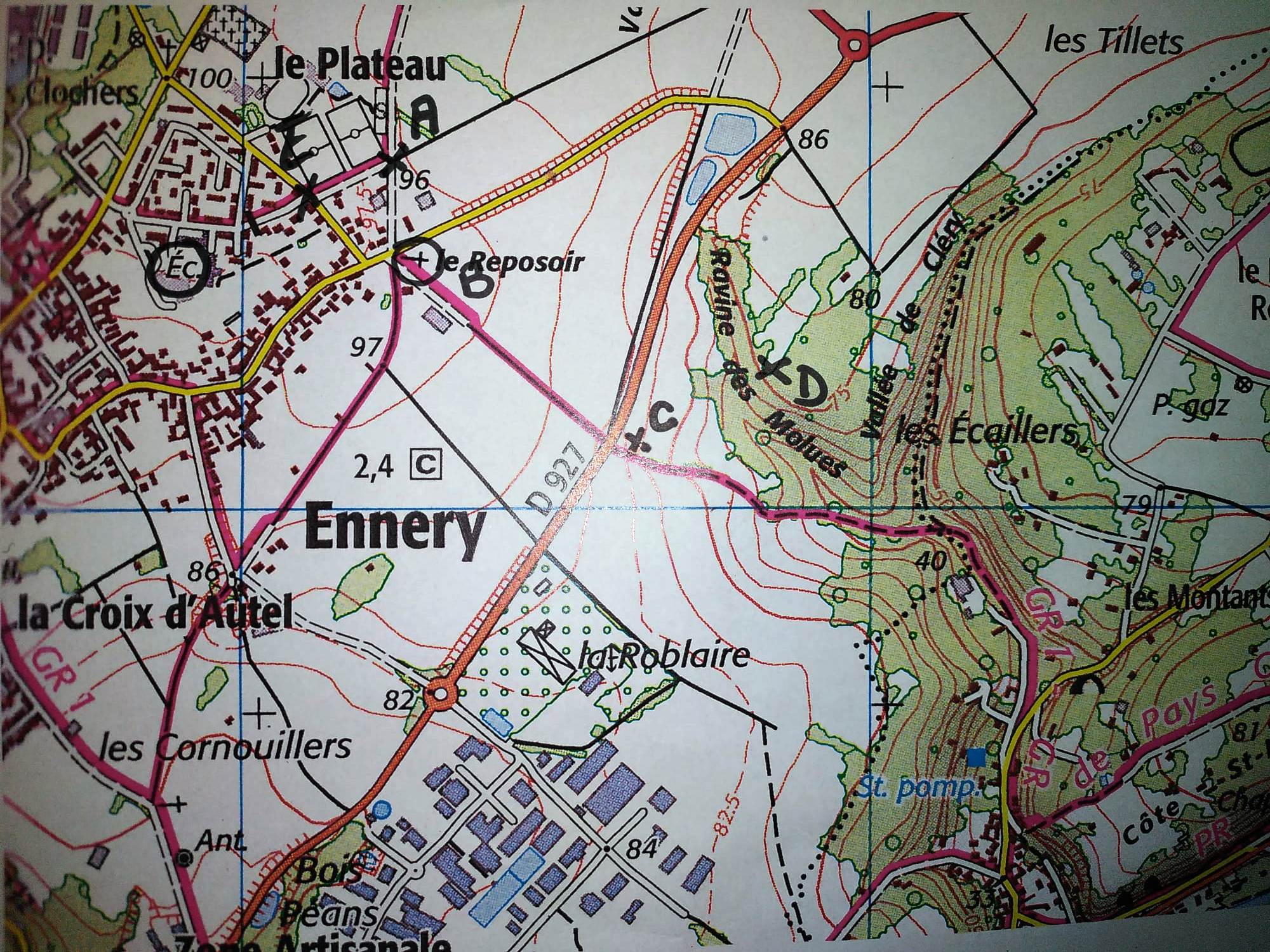 Les enfants devaient noter le nom de leur équipe et les noms des enfants qui la composaient puis ils devaient noter aux bons endroits les 5 points A, B, C, D et E. Enfin, ils devaient donner la distance entre le point E et le point A sachant que j'avais fait 200 pas et que mes pas mesuraient 0,8 mètre puis devaient donner le nom de la croix sur le calvaire situé au point B => la Croix du reposoir.