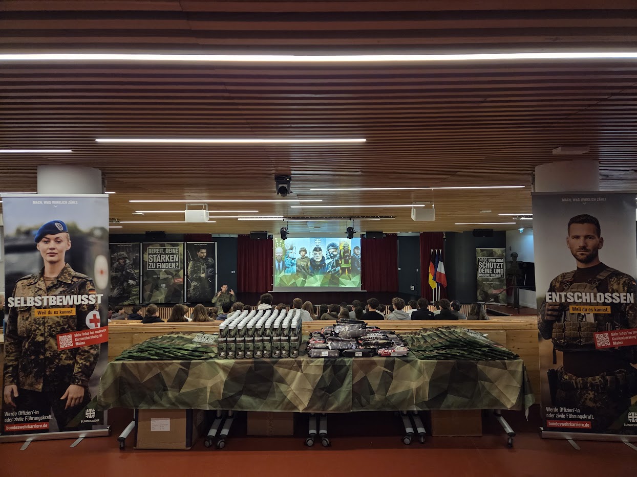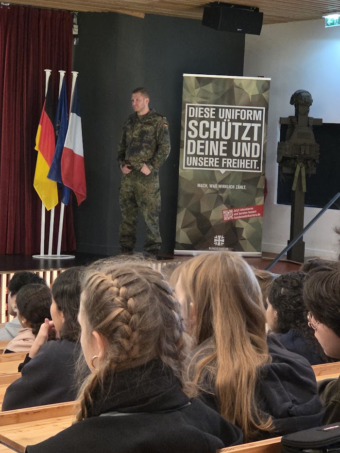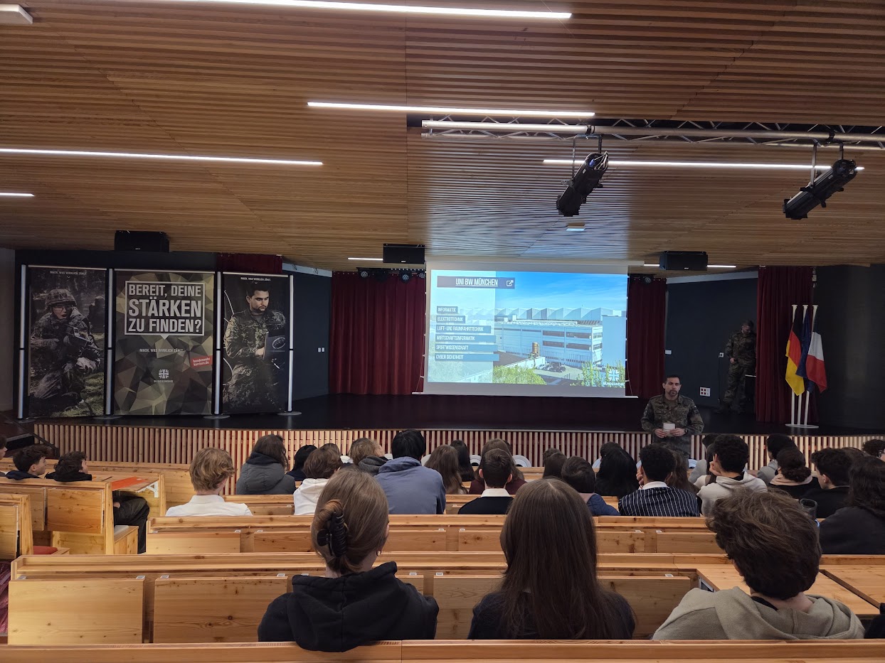 - Vendredi 28 novembre 2025 de 9h00-10h30 : Conférence dans l'Auditorium sur les chances de carrière au sein de la Bundeswehr : 3D, 2DE1, 2DE2, 1AF, TES/L(AF)