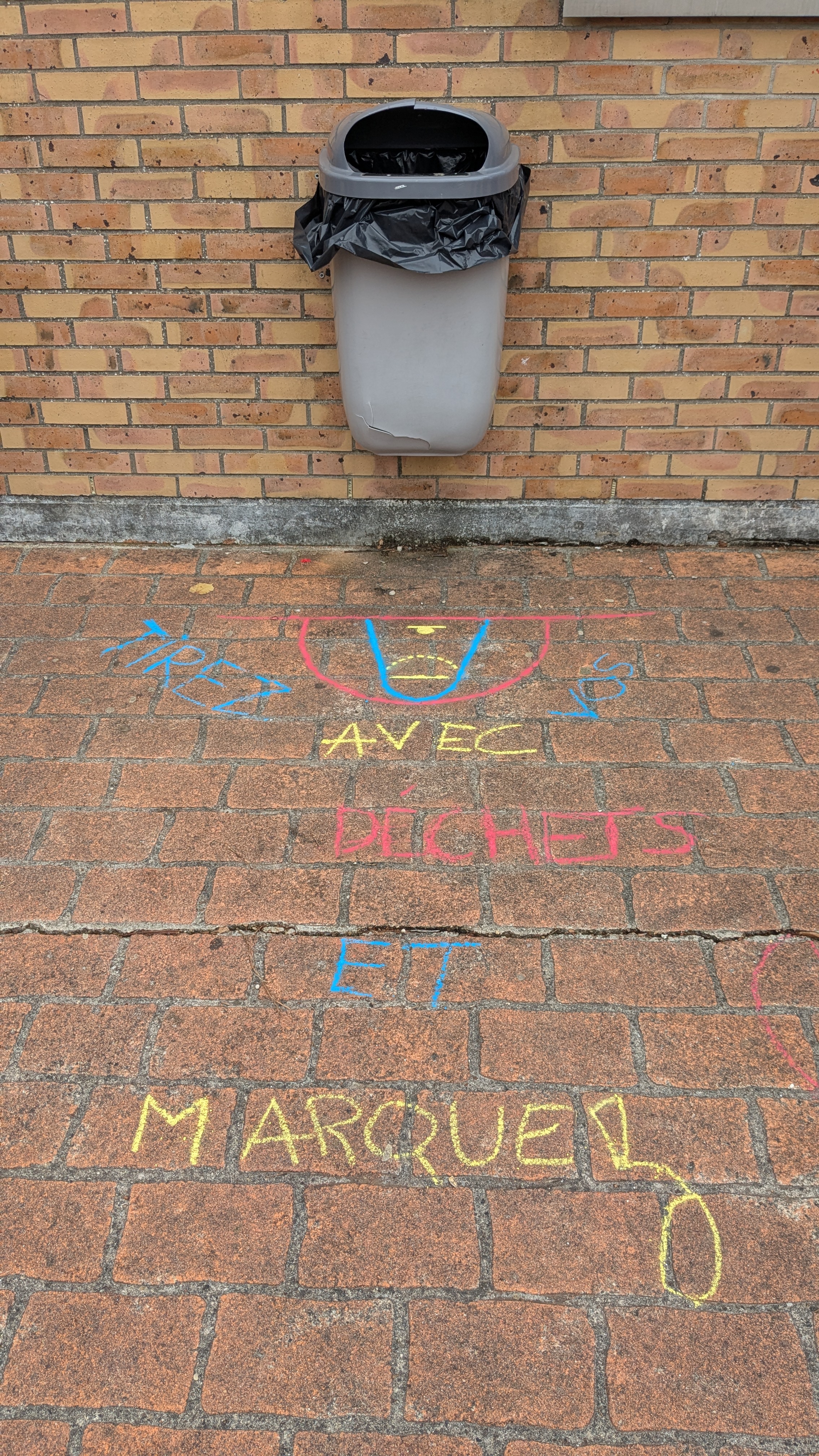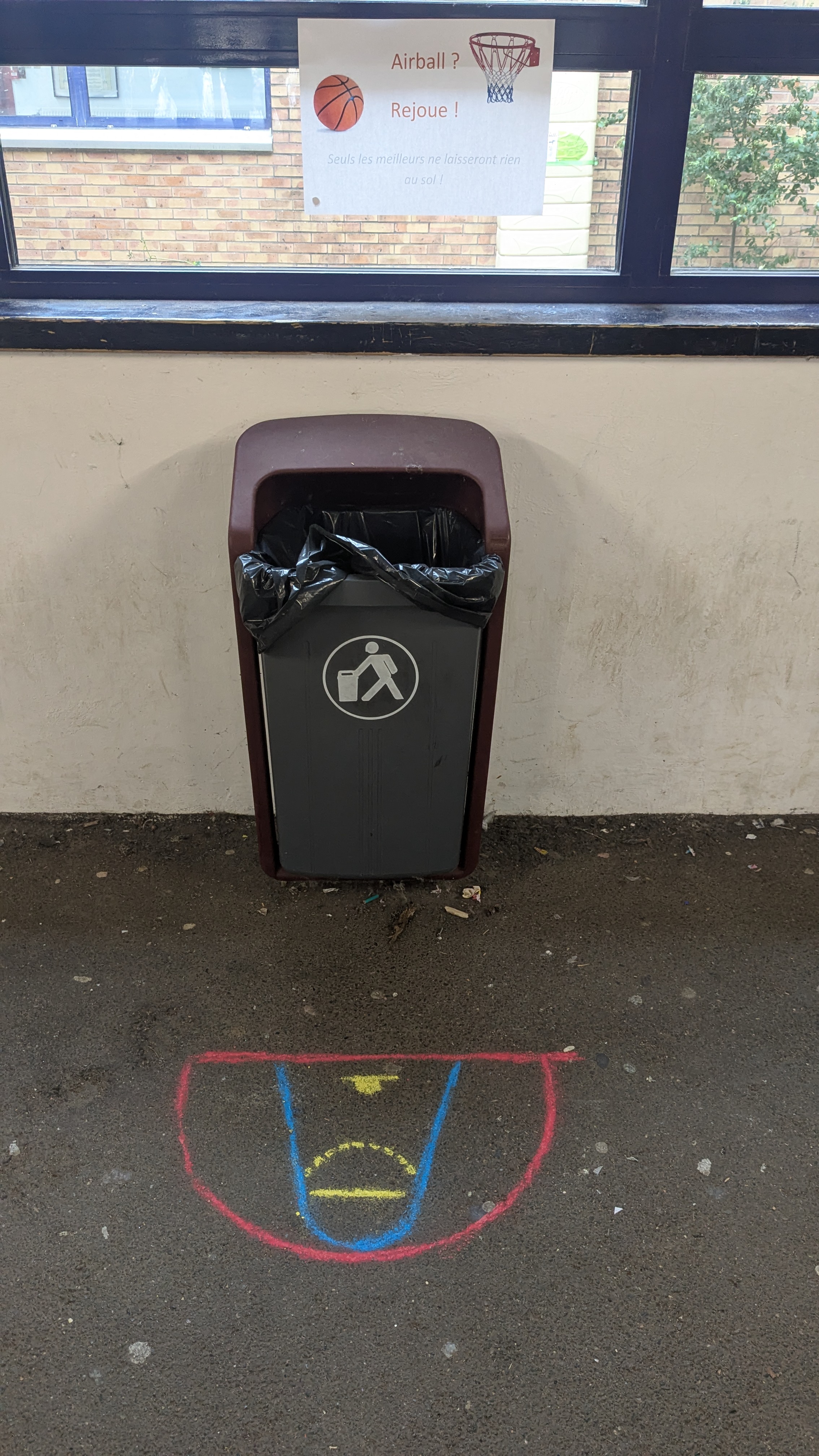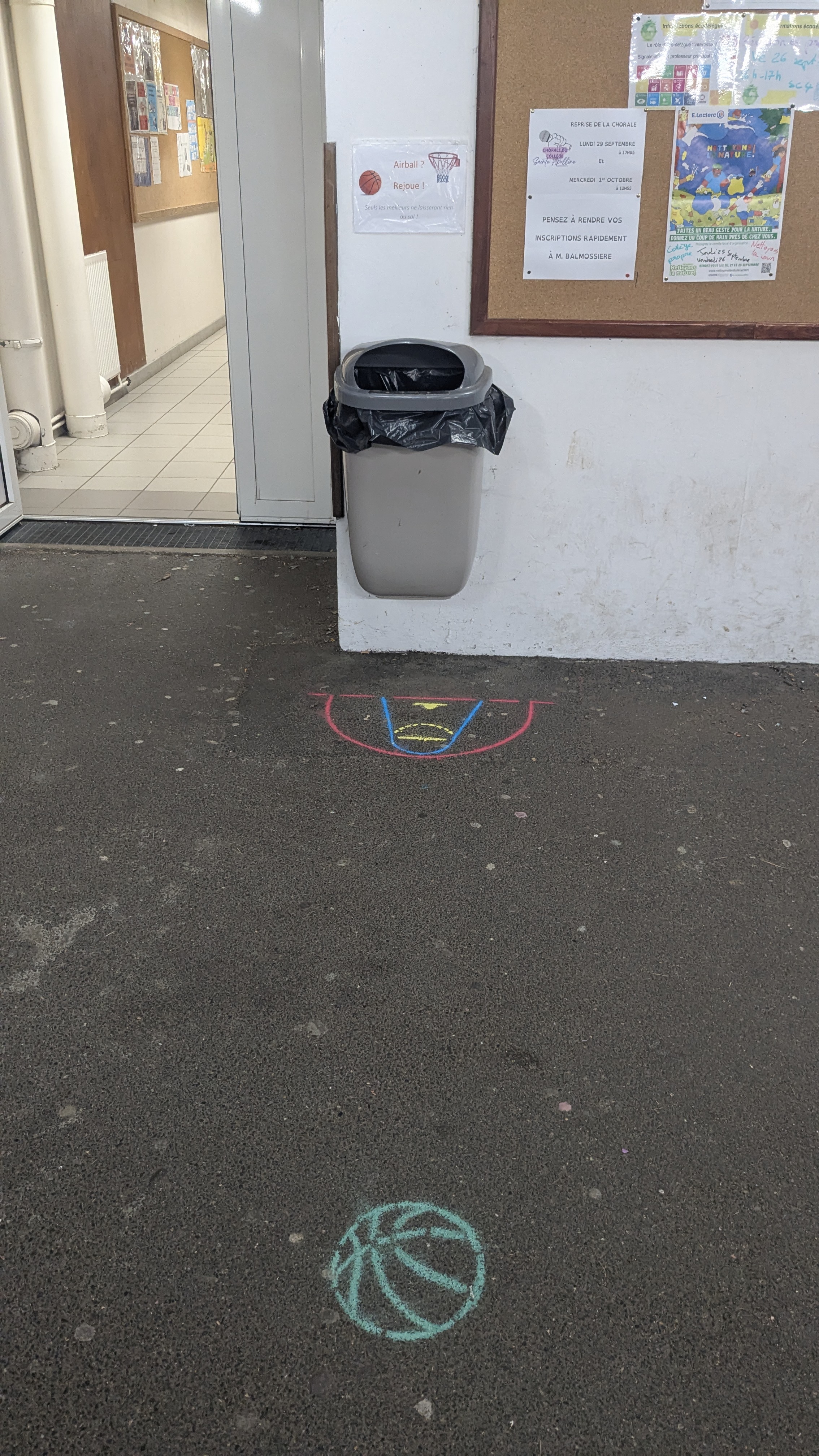 Via des indications horizontales (traçages à la craie) et verticales (des affiches) nous incitons les élèves à utiliser les poubelles de la cour du collège en "marquant des paniers".