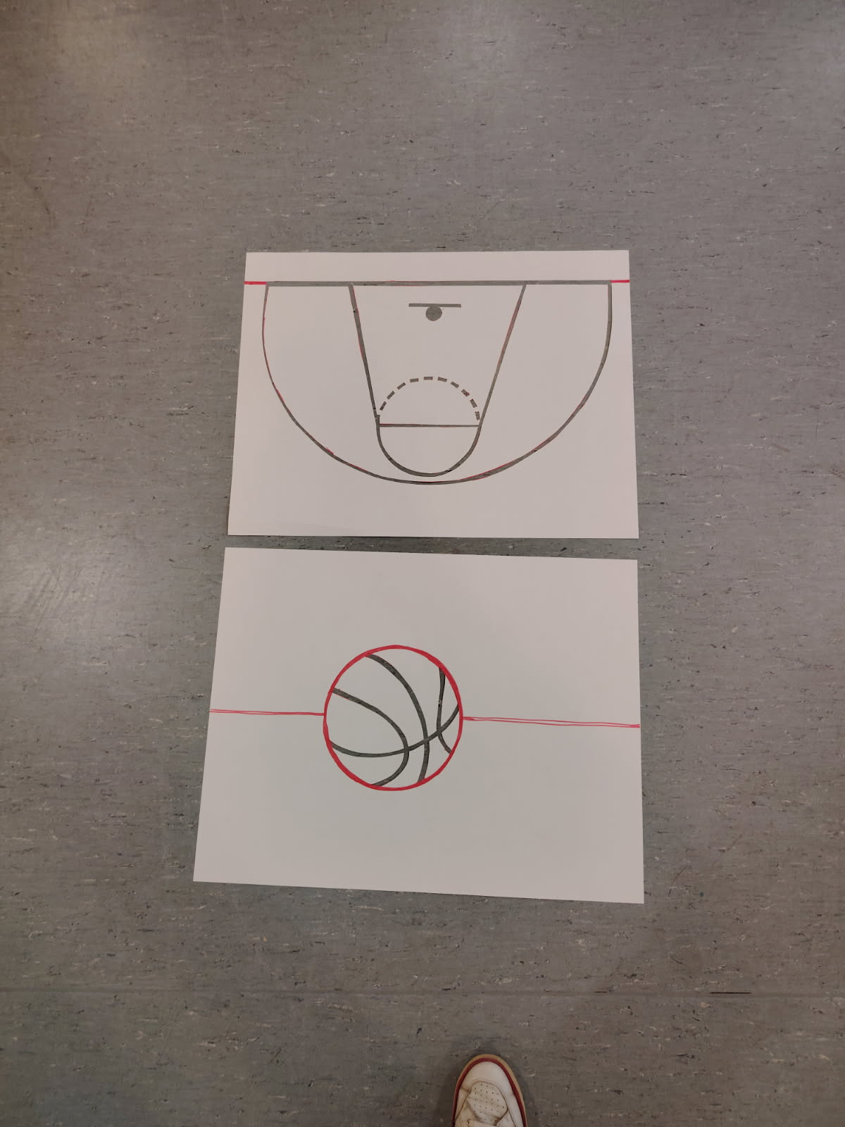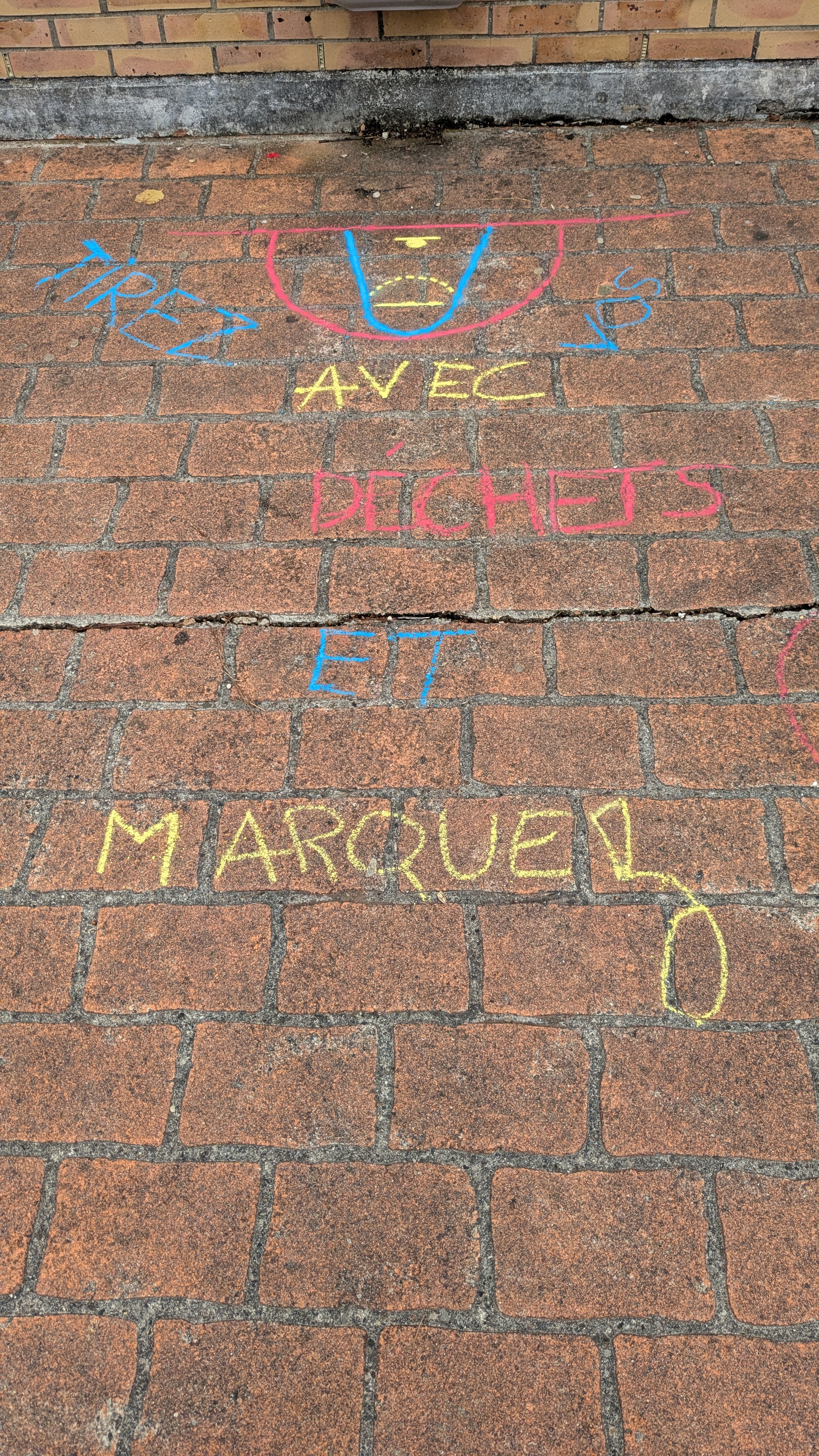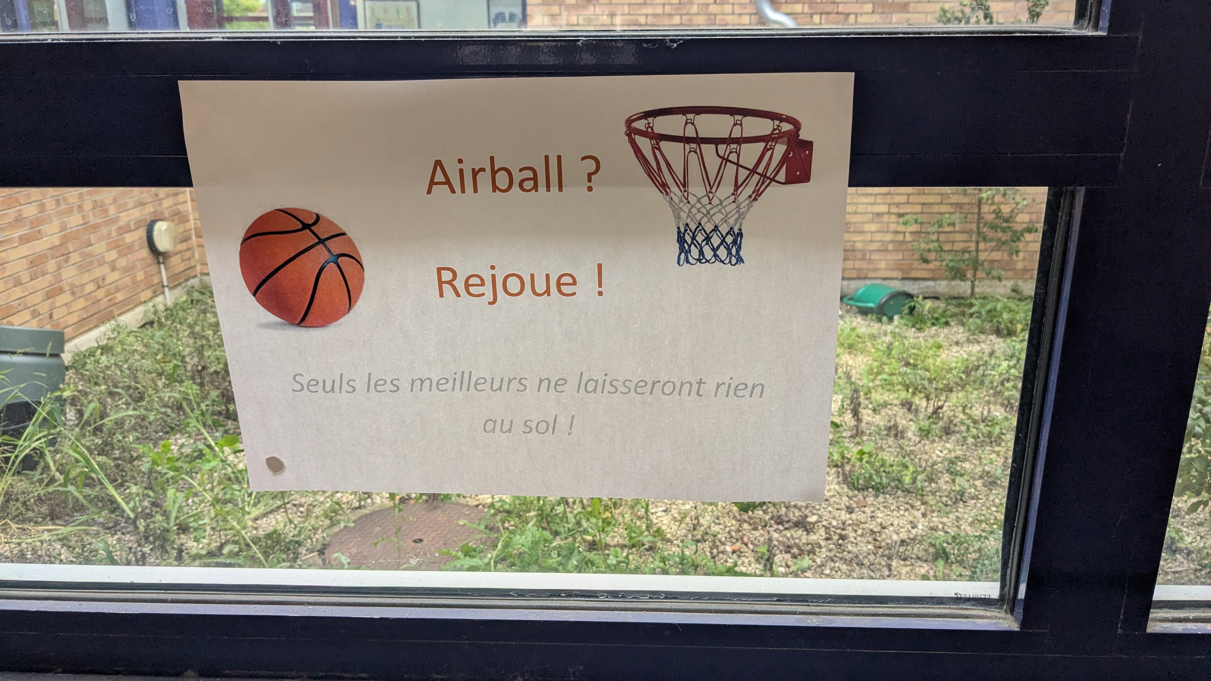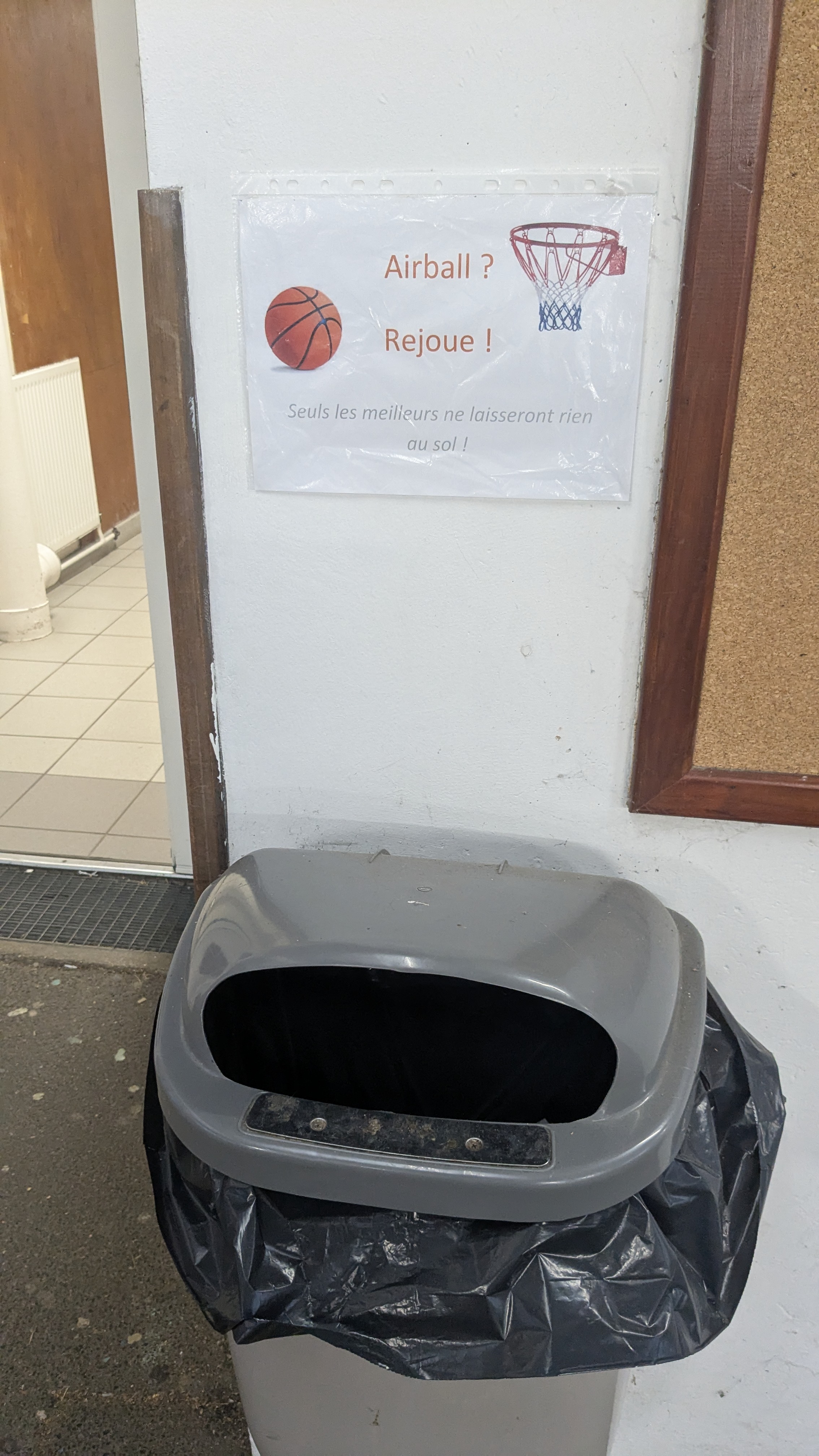 Via des indications horizontales (traçages à la craie) et verticales (des affiches) nous incitons les élèves à utiliser les poubelles de la cour du collège en "marquant des paniers".