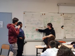 Par petit groupe de trois élèves nous nous isolons pour imaginer la narration. Penser le premier niveau nous semble assez facile, mais la structure narrative des niveaux suivants est plus compliquée. Sans doute nous manque-t-il encore une vision très précise de ce que nous voulons montrer et dire. Nous ferons sans doute évoluer la narration au gré de ce qu'il nous sera possible aussi de représenter.