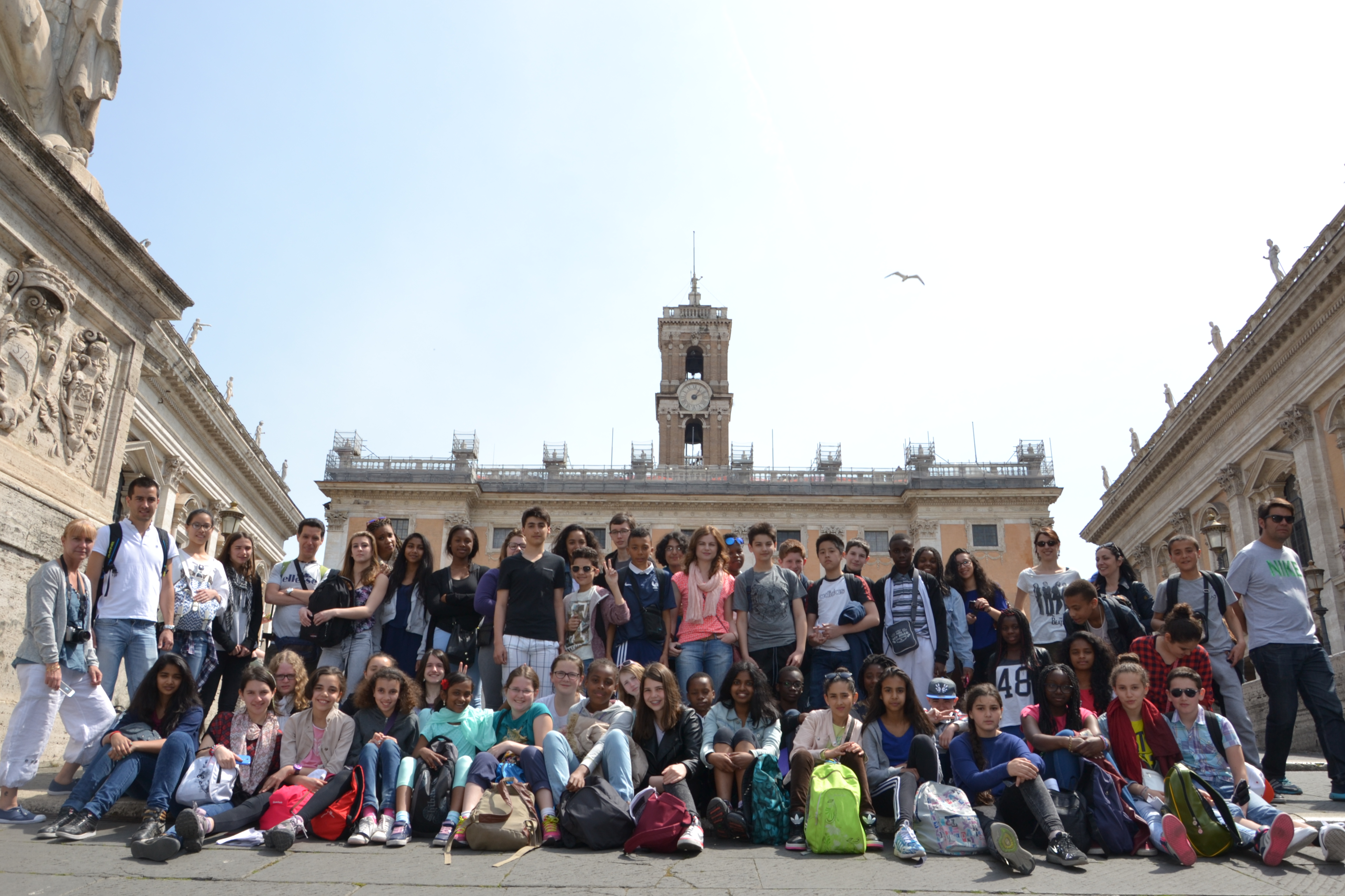 Voici une petite photo de groupe pour vous montrer que tout le monde est en forme et qu'il fait très beau à Rome !J'en profite pour répondre à quelques familles soucieuses d'avoir plus de nouvelles sur ce blog : nous essayons de l'alimenter au mieux, nous le faisons au moment où nous avons du wifi gratuit à l'hôtel dans le temps qu'il nous reste entre le retour et le moment de se coucher.